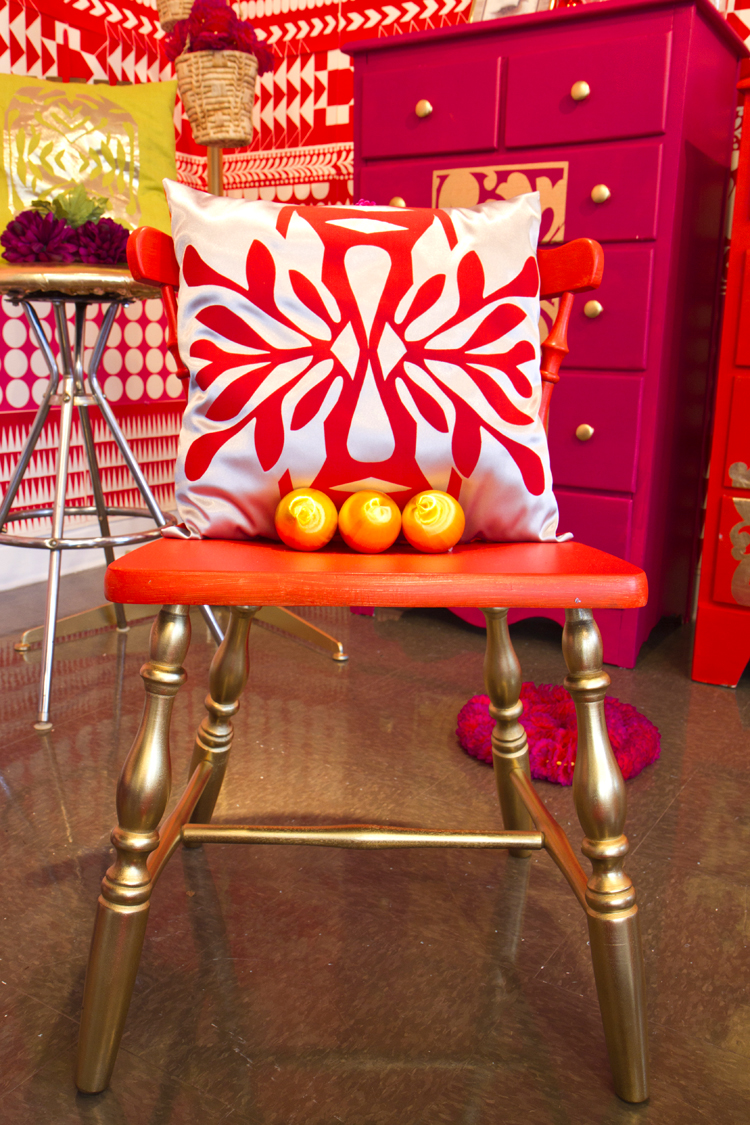 Holiday baubles, applique on fabric, screenprinted wallpaper